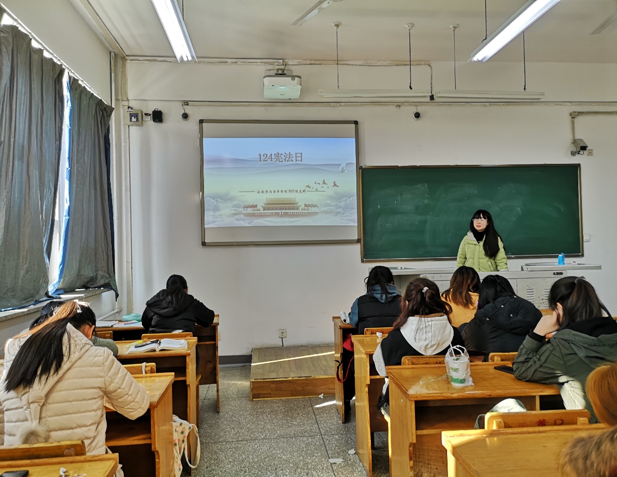 首先,主持人闫晨洁通过介绍国家宪法日的来历、设立国家宪法日的目的与意义、全面推进依法治国等国家宪法日的相关信息,引导同学们树立了亲近宪法、尊敬宪法,加强宪法实施的法治观念。之后,主持人与同学们共同学习了《中华人民共和国宪法》,观看了视频《依法治国六字方针》,进一步增强了同学们的法治意识。最后,团支部组织开展了宪法知识竞赛活动,在竞答过程中,同学们踊跃抢答,精彩绝伦的对决一次又一次将现场气氛推向高潮,使同学们在答题中锻炼了大家的法治思维,增强了同学们学习宪法、尊崇宪法的思想自觉和行动自觉。