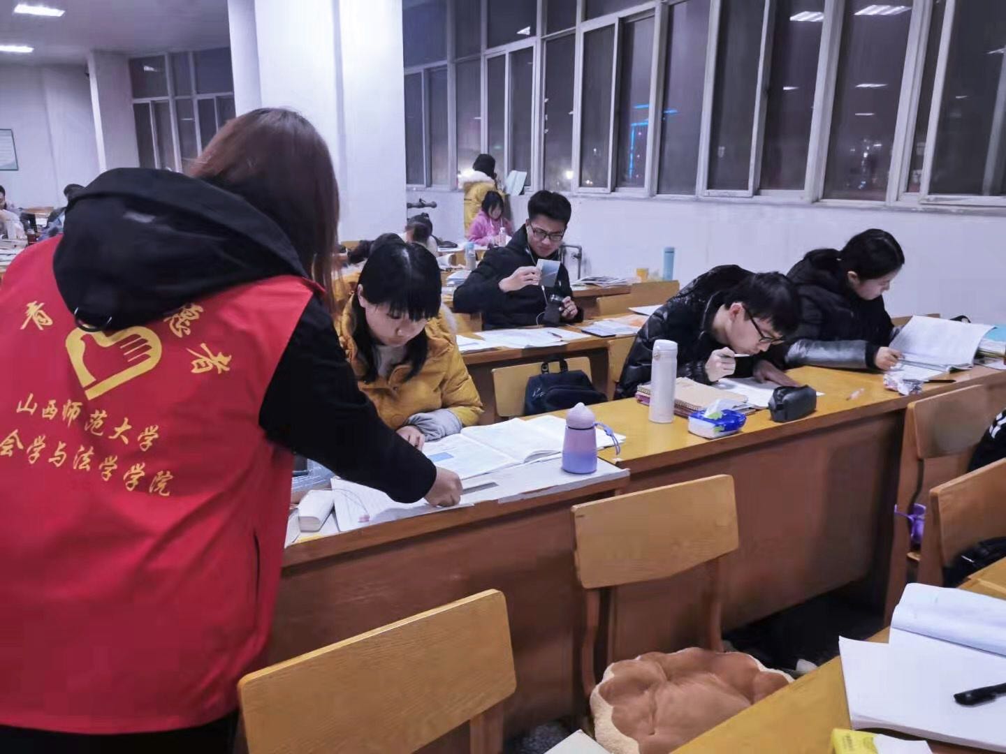 活动前期,志愿者们将同学赠予考生的写有祝福语的卡片进行了收集整理。晚上7:30,志愿者准时在新松广场集合。在负责人进行任务分配和分发祝福卡之后,志愿者一起前往自习室,在不影响考研员工学习的前提下,向考研同学分发了承载着同学们美好祝福的卡片。