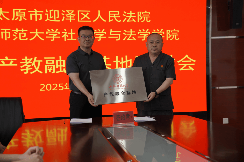 为深化法学教育改革,创新法治人才培养,2025年6月27日下午,我院与太原市迎泽区人民法院成功举行共建产教融合基地研讨会暨签约授牌仪式,标志着双方协同育人合作步入制度化新阶段。研讨会由迎泽区人民法院副院长王杨汀主持,法院党组副书记、副院长李彦君及各业务庭负责人,我院院长安晖、副院长单云慧、法律系主任刘龙新等参加。